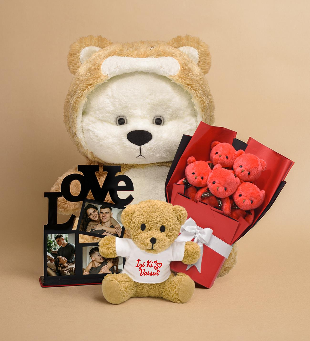 Kişiye Özel Uykumcuk Ayıcık - Pelüş Ayıcık Buketi - 3'lü Çerçeve - 25 cm Çiçek Serisi